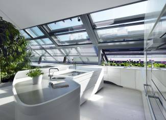 The 36sqm kitchen area works as a meeting and communication area for the 5-member family. The whole space is bright, friendly and practical - matching the architectural needs of the whole apartment. The owner’s wife, is an enthusiastic cook - who loves to treat her family and guests with culinary meals. She wanted to have a central kitchen island with enough work surface for multi-course menus, an extensive view of the living room, and space for fresh herbs.