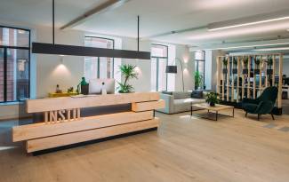 Flexible in function, the open-plan space features a simple yet eye-catching reception desk at its centre, which is made up from layers of natural timber blocks with HI-MACS® used for the desk area behind. ‘The reception desk is the first piece of furniture seen when entering Instil’s offices,’ adds the designer, ‘and is also visible from the board room and waiting area, so it was vital that it made the right impression in all directions. Our concept was for an urban garden, which we achieved by constructing large beams in solid maple, one of which was extended to create a planter along one side of the desk to shield paperwork from clients’ view.’ The Instil logo was water-jet cut in solid maple and positioned in between the beams then finished with integrated lighting to highlight the typography. ‘We used HI-MACS® in Dark Night to create a clean, dramatic backdrop in contrast to the maple, making the brand really stand out.’