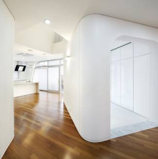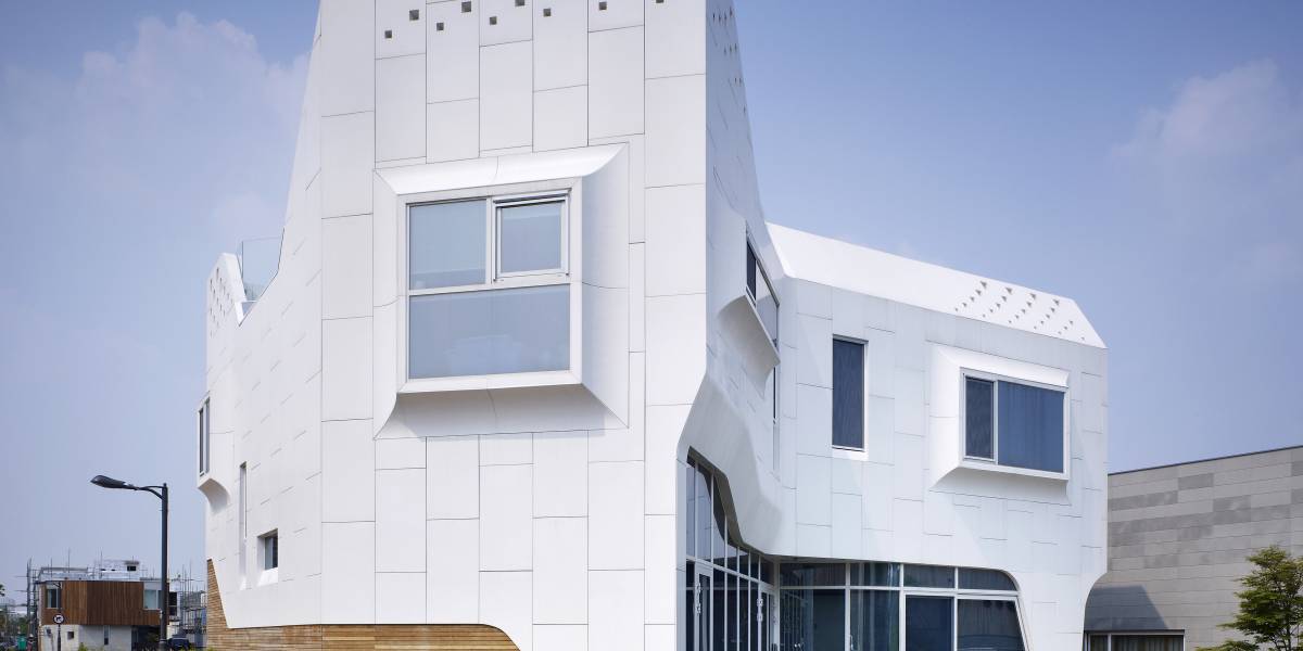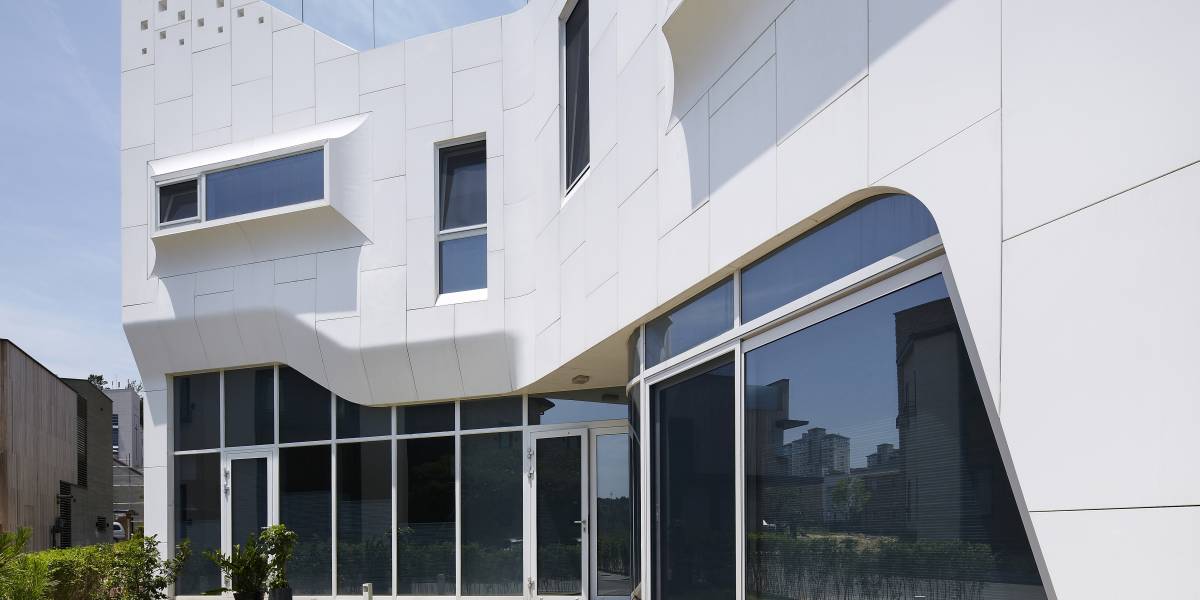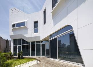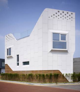 The Pan-gyo Residence was built on a luxury site of detached houses, following a tender for which illustrious architects were invited to bid, and it is now the most striking house in the district. It stands on a corner lot of around 300 m²; on the west and north sides it extends as far as the edge of the lot, while to the south and east its organic, asymmetrical shape flows around a green space and wooden terraces. Its snow-white walls emerge from a wooden base like a petrified sea wave, with the foam expressed by the perforation of the façade. This new way of shaping the façade and the cubature of a living space, breaks with the way in which residential buildings are traditionally built in Korea, and demonstrates a new and innovative kind of living space design.