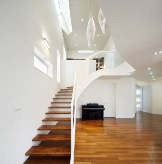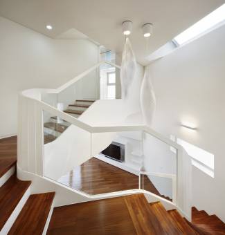 Kiwoong Ko continued his consistent use of the material into the furnishings. The built-in furniture in the living room, the open-plan kitchen with an island, and the banister of the sculptural staircase leading from the living area to the upper floor, are all made of HI-MACS® and, with their warm feel, lend the space both cosiness and elegance.