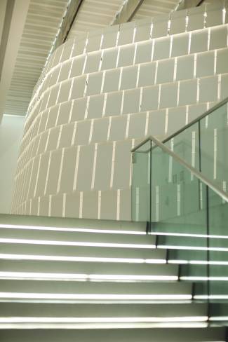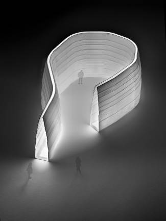The installation consists of a ring-shaped construction that is open, allowing one to walk around the inside. It is constructed from a tubular structure covered with a shell of over 800 shingles in HI-MACS® Alpine White that are slightly apart from one another. A lighting system with LED strips is integrated into the structure and interacts with the various levels, emphasizing the volume and giving the whole structure an ethereal accent. The design creates a sensory journey to be experienced slowly, exploring both the space and the emotions themselves. One emerges slightly disoriented, but also more aware.