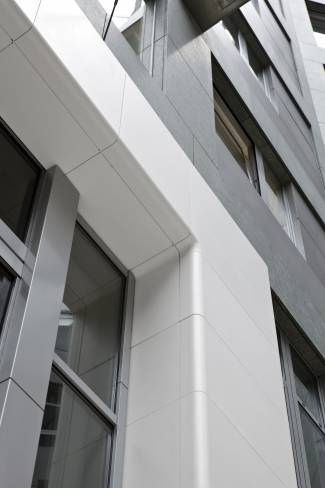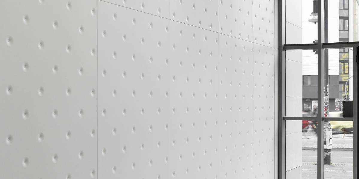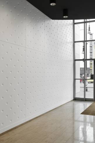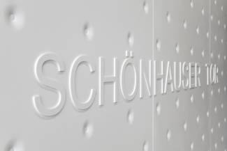 The brightness of the installation continues inside the building: even the foyer, which acts as a connecting element between the entrance and the atrium of the building, is made of HI-MACS®. The elements are in Alpine White colour. The ornamental decoration recalls the textile wall coverings or padded and quilted surfaces. The width and depth limited of the joints between each individual slab produces the effect of a mesh, yet the entire surface still appears to be uniform and homogeneous. The counters, letterboxes and benches in the covered hall of the Schönhauser Tor were all made of acrylic stone as well. Thanks to the use of HI-MACS® both outside and inside the building, the entire project for the entrance takes on a uniform and bold character.