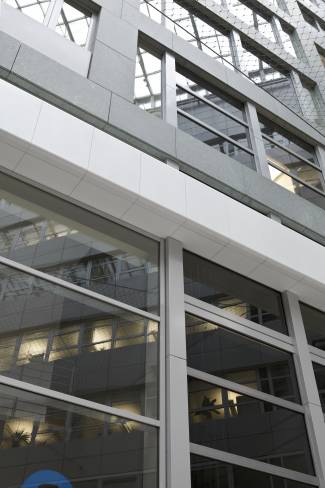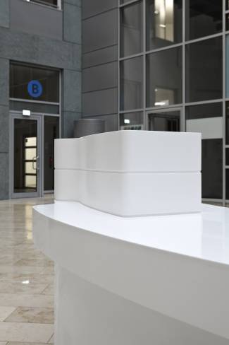 To renovate the entrance of the building, the architect Resa Gartner, of Studio neo systems architects in Berlin, nonetheless preferred a different project: the atrium of the building is reached by crossing a bright entrance which is a net contrast with the current glass and natural stone façade. “To achieve a Corporate Design of the different works – i.e. parts of the decorated and backlit façade as well as the interior décor – we chose the HI-MACS® acrylic stone by LG Hausys. Such a broad range of applications and the creation of seamless structural elements with double-curved surfaces would not have been possible with any other material” states Gartner.