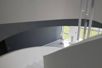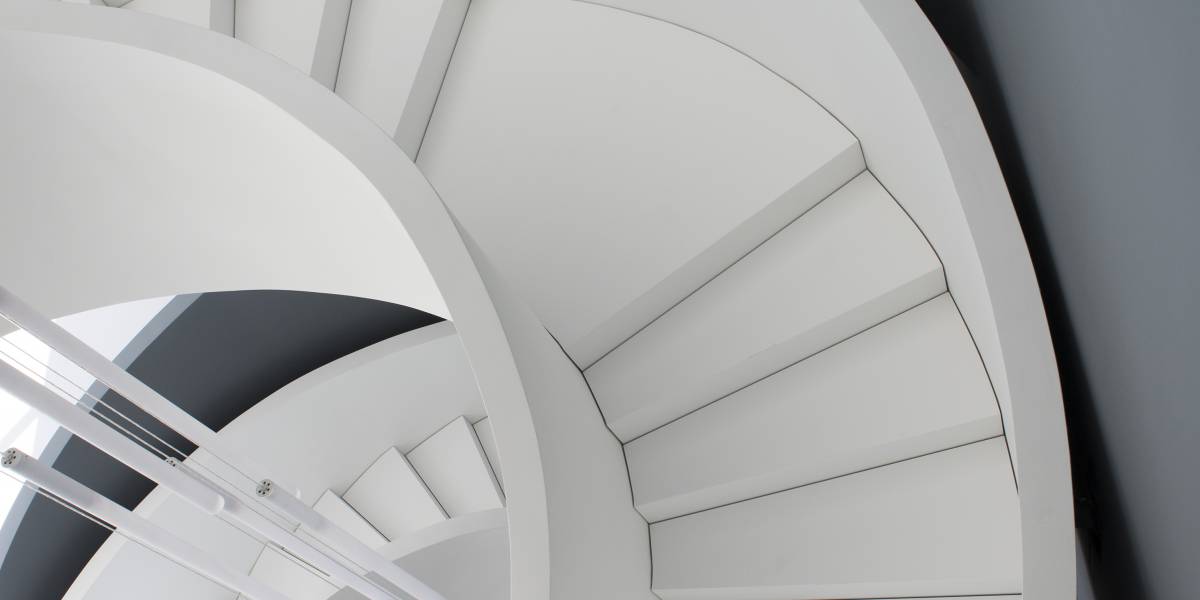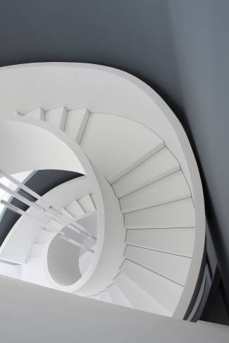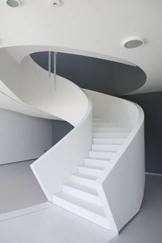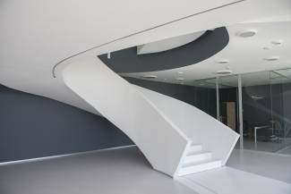 The company, leader in the production of stainless-steel dished heads, was in fact looking for a metropolitan and contemporary style to set up its new office block on the main façade of the administrative/manufacturing complex. Hence it turned to the designer who decided to opt for HI-MACS® to create a staircase on three floors giving an imposing and dramatic result.