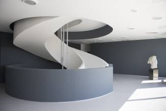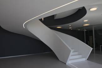 The shape of the structure, which like a helix rises from the inner gate of the building, is then highlighted in places by strips of light which underscores its graphic and spectacular character. The desire to obtain a single surface, without any change of material between dark and light, did in fact prompt the architect to experiment with a backlit system for the steps, for which HI-MACS® is also the perfect material.