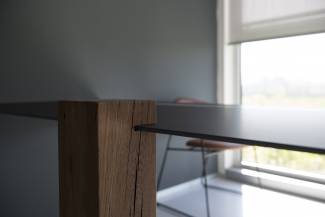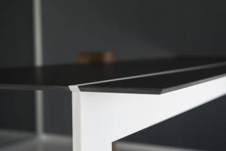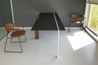 In addition to the magnificent staircase, HI-MACS® also makes a subtle appearance in another room: This New Generation Acrylic Stone has been used to create a structural detail of the meeting room table, a horizontal line which follows the complete length of the 240 cm top, before turning into an extremely slim but sturdy leg. This unique piece, was conceived to link the major architectural piece of the building, with a tiny detail in the meeting room, and thus complete a comprehensive project with an definite personality.